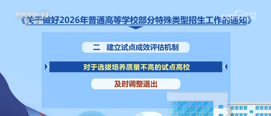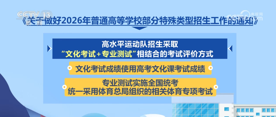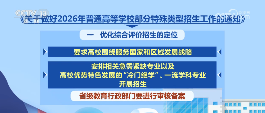 央視網(wǎng)消息:日前,教育部印發(fā)《通知》,部署做好2026年普通高校部分特殊類型招生工作。普通高校特殊類型招生主要包括藝術(shù)類專業(yè)招生、高水平運(yùn)動(dòng)隊(duì)招生、保送生、綜合評(píng)價(jià)招生4類。